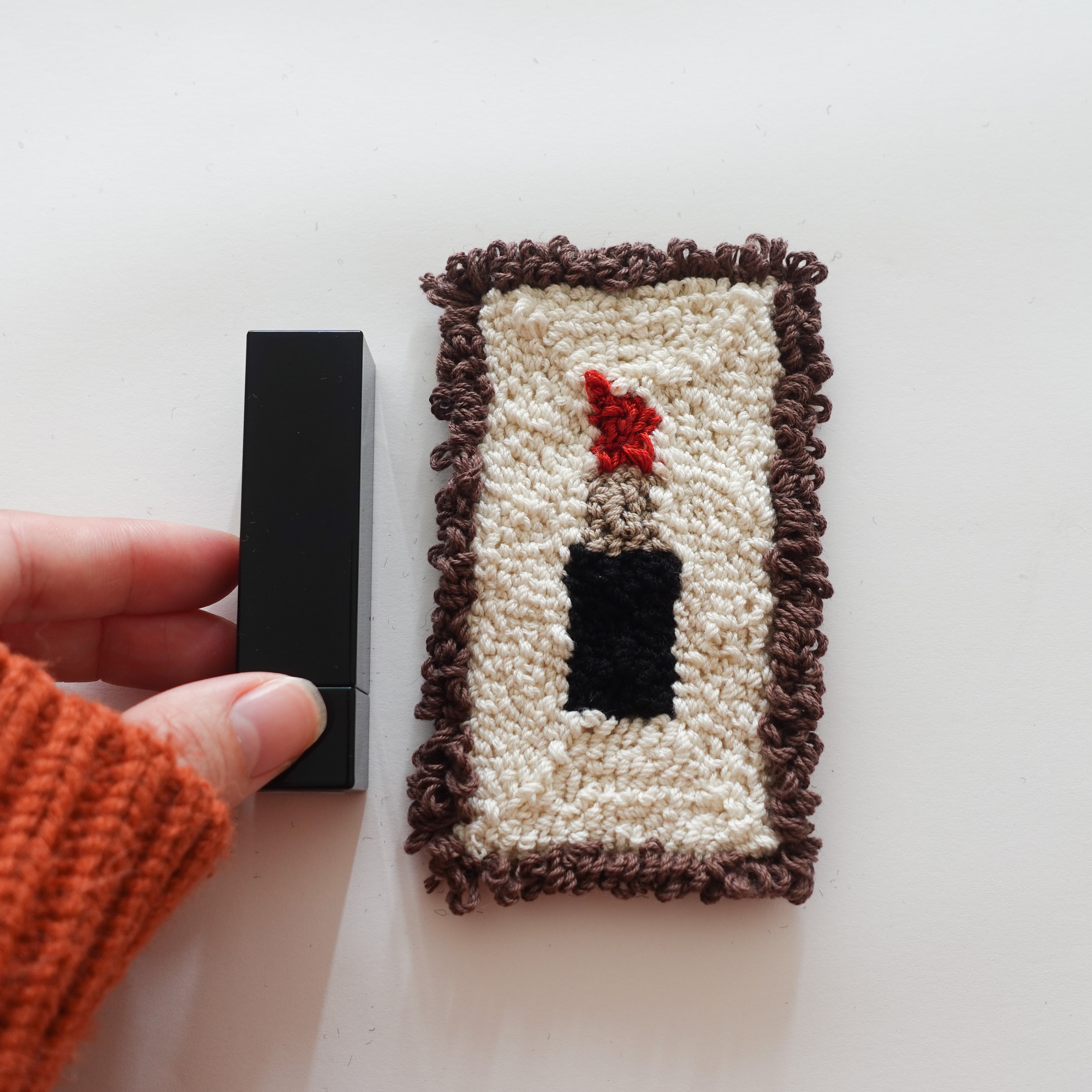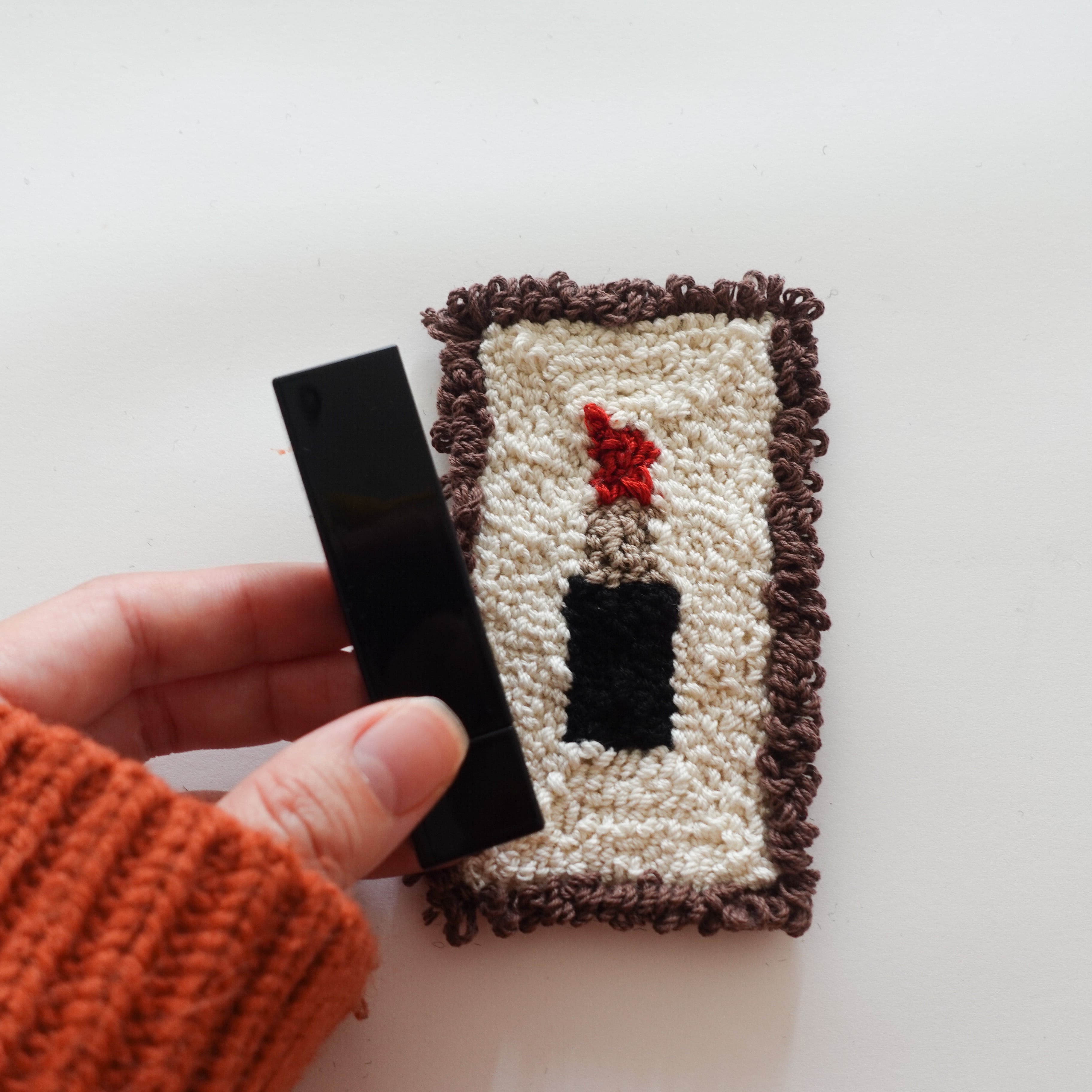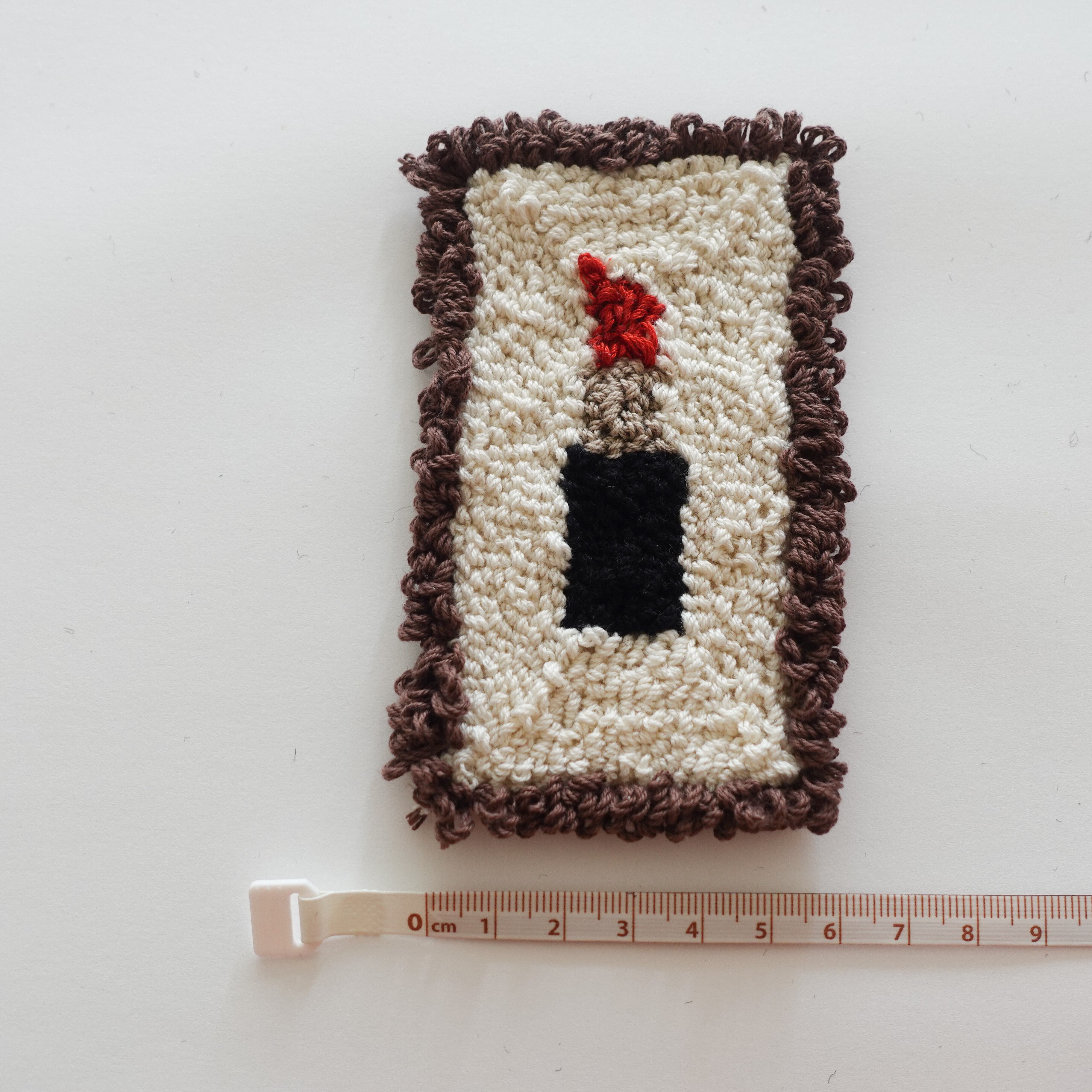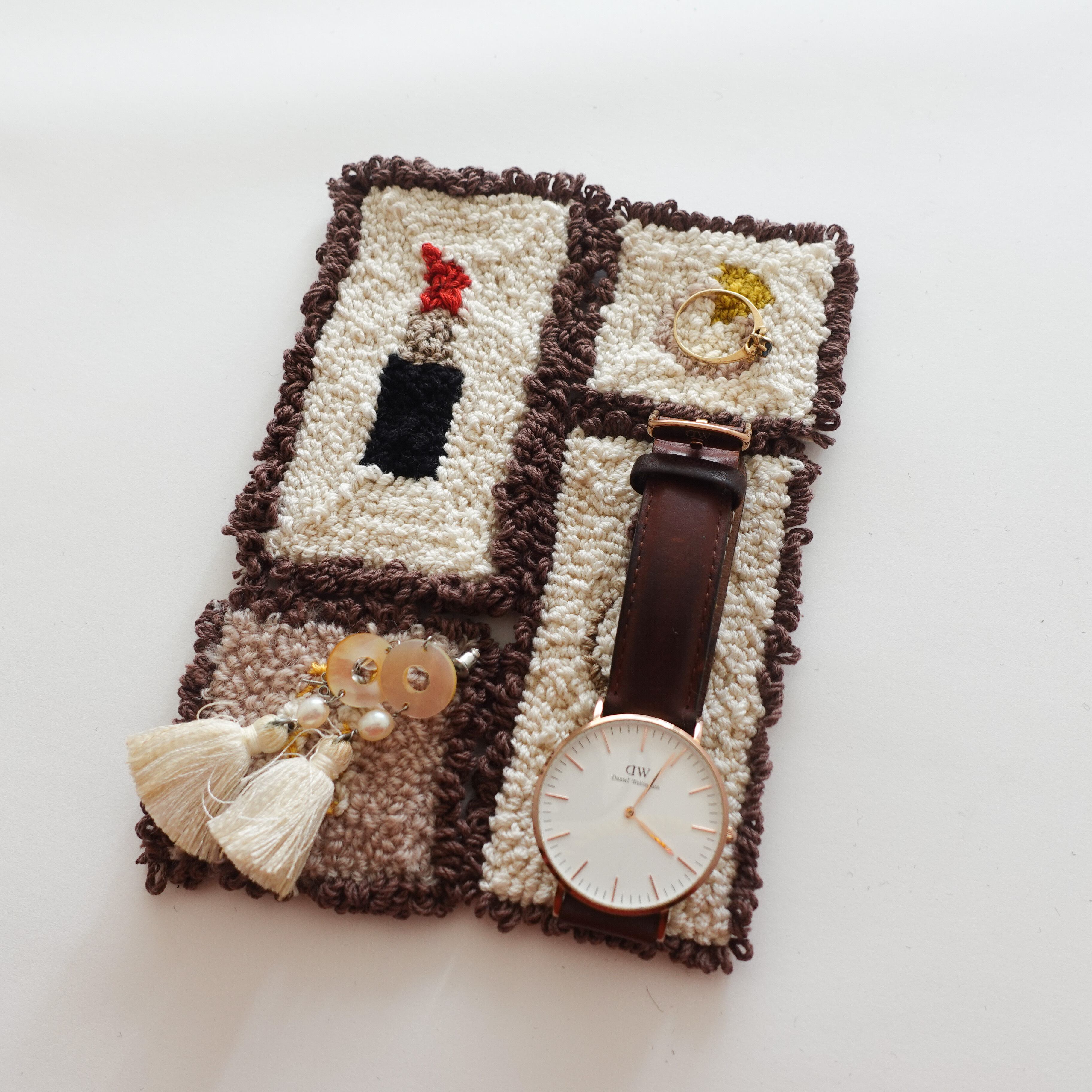 イラスト刺繍よりも枠の毛糸(ブラウンの部分)が高くなるように作っているため、転がってしまうことを防ぎます。小物が四角でも丸でも気にせず置くことができるので安心です。