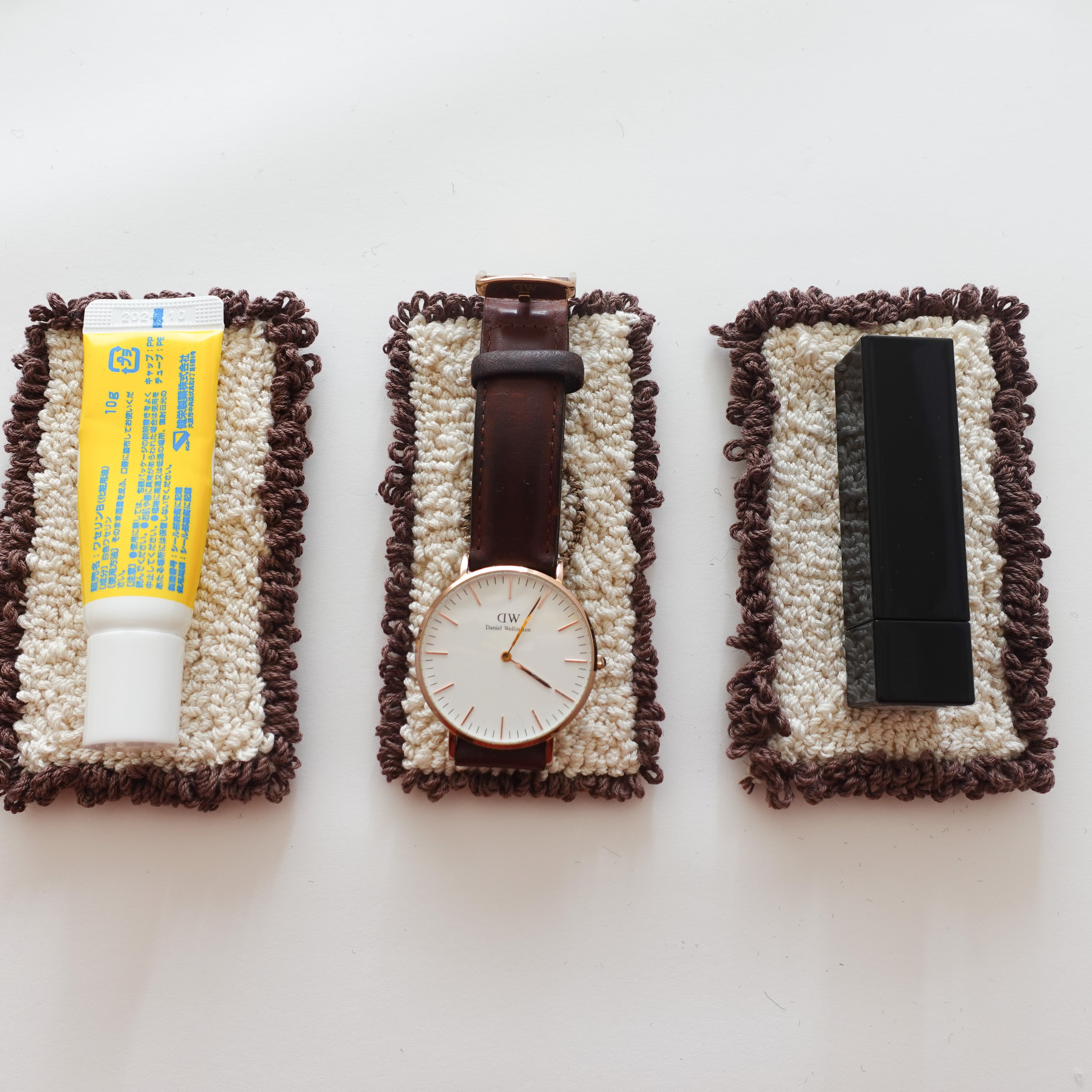 刺繍、毛糸を使用しているので、上に置く小物が瓶でもプラスチックでも傷つくことはありません。